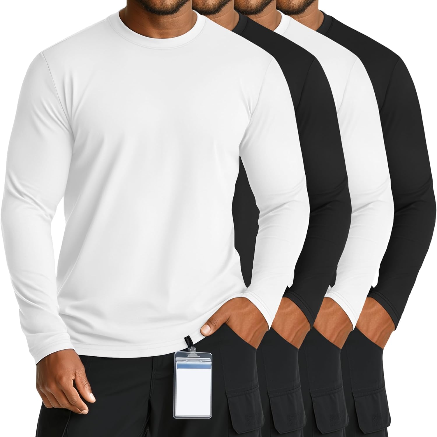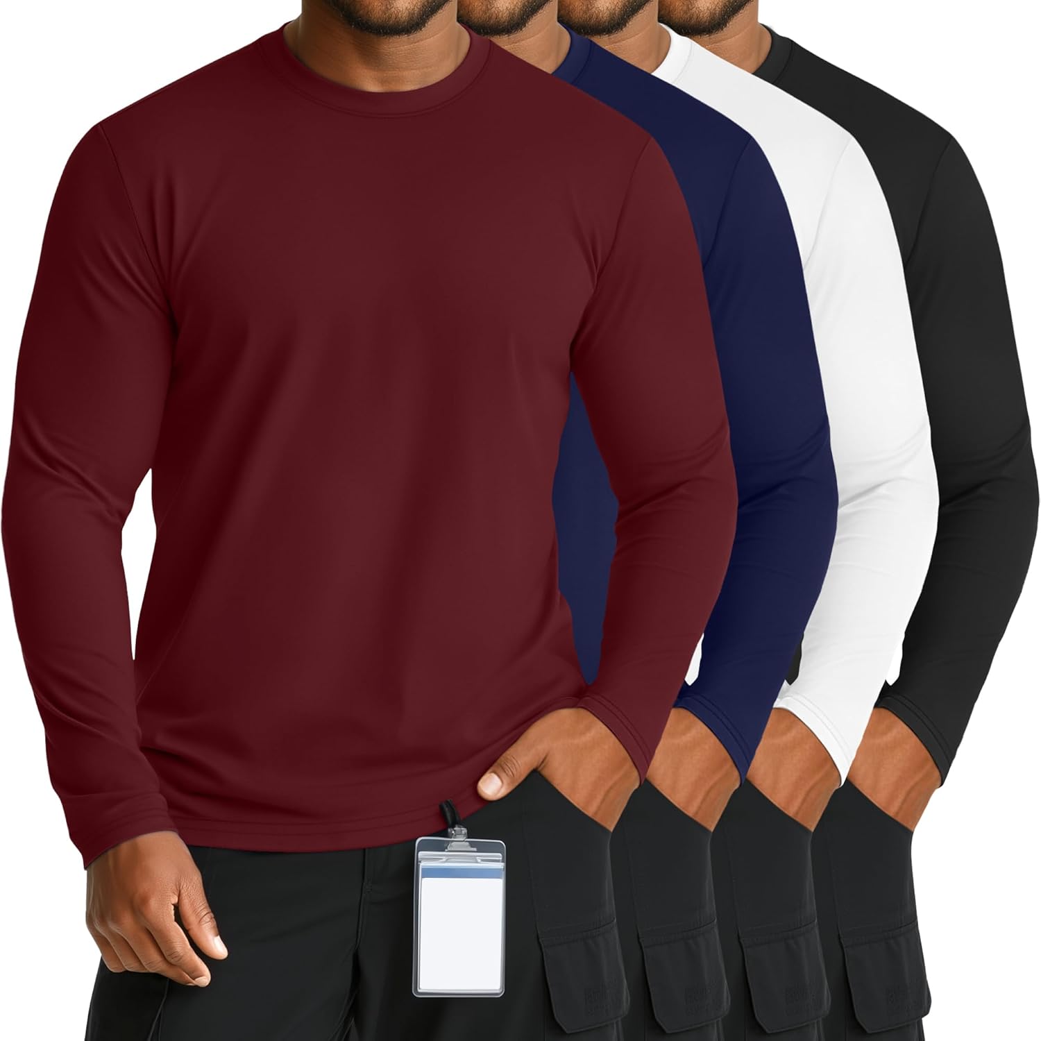 Features: Crafted from a soft, stretchy blend, this underscrub tee provides total freedom of movement for your longest shifts. It's designed to perform, with moisture-wicking fabric that keeps you fresh and a durable build that holds its shape wash after wash. The discreet crew neck lays flat and stays hidden under scrubs, offering reliable, non-bulky warmth as your perfect uniform base layer. Designed specifically for Big & Tall men (XL-5XL), this set offers four colors for effortless daily matching. But its utility goes far beyond the workplace. This shirt is your go-to for everyday comfort. Perfect for lounging, weekend outings, or as a warm layer under a jacket, it seamlessly transitions from a demanding shift to your downtime. Specifications: Material: 65% cotton, 30% polyester, 5% spandex Package includes: 4 x Men's big and tall underscrub shirts Note: Please check the size chart before ordering. For manual measurement, please allow slight size errors. The colors may vary slightly due to different screen displays. Hand wash in cold water or machine wash on a gentle cycle, hang or line dry, and do not bleach
