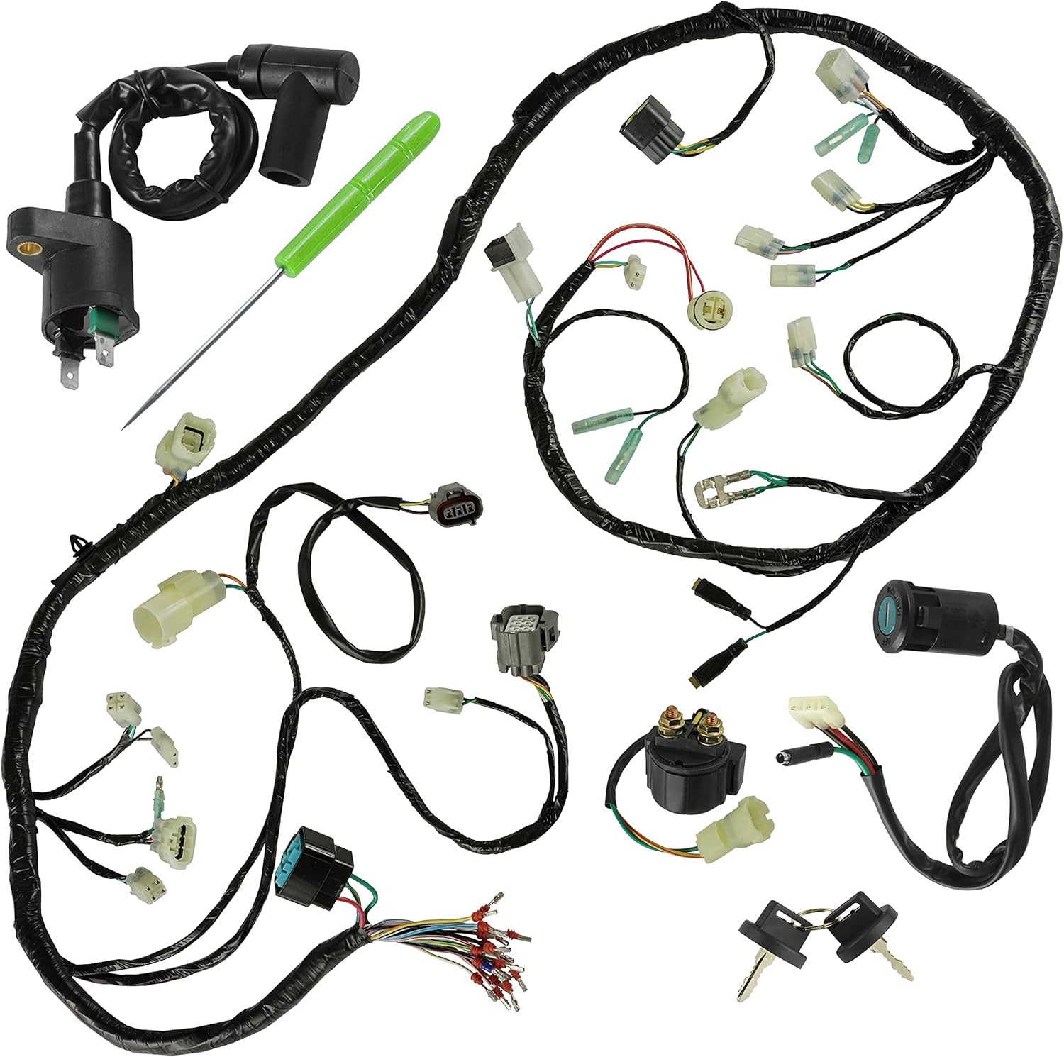 Compatible with Honda modelsRecon 250 TRX250TE 2005-2006Part Number:Wire Harness:32100-HM8-B10Starter Relay Solenoid:35850-HM8-B00Ignition Coil:30510-HM8-00030510-HN6-000Ignition Switch Key:35100-HN6-A3035100-HM8-00035010-HF1-67035100-HN1-000Specs & Dimensions:Starter Relay SolenoidHeight: 48mm | 1.9"Length: 33.5mm | 1.3"Terminal Spacing: 19.5mm | 0.8"Ignition CoilHeight: 44mm | 1.73"Length: 50mm | 1.96"Mounting Hole Distance: 6.3mm | 0.24"Ignition Switch KeyHeight: 43mm | 1.70"Length: 29mm | 1.15"Gears: 2 Shift
