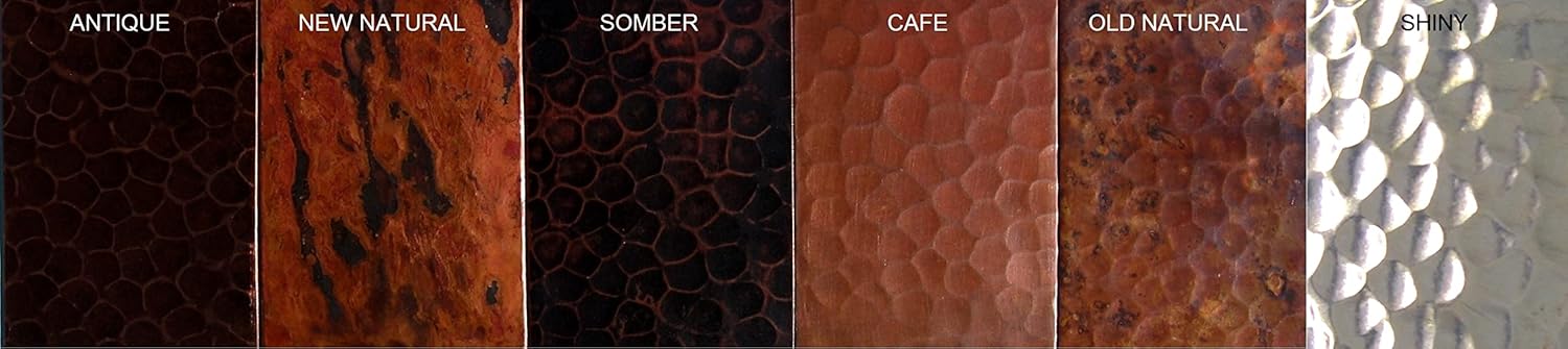 Hand Made and Hand Hammered Copper Bar Top, Heavy 20-gauge Copper permanently attached to a wood substrate at 1.5" overall thickness. Multiple pieces can be joined to make a larger bar top or an L-shaped top. Clean with mild dish soap only. The copper will change over time with exposure to its environment. Please note that the photos are in several of the different patinas. Please choose your patina from the color chart photo and navigate to the appropriate size and color window to make your purchase. Use a furniture polish or wax occasionally to provide some protection and to renew the product's sheen. Weight approximately 42 lbs (a handmade item's weight may vary slightly from one to the next).