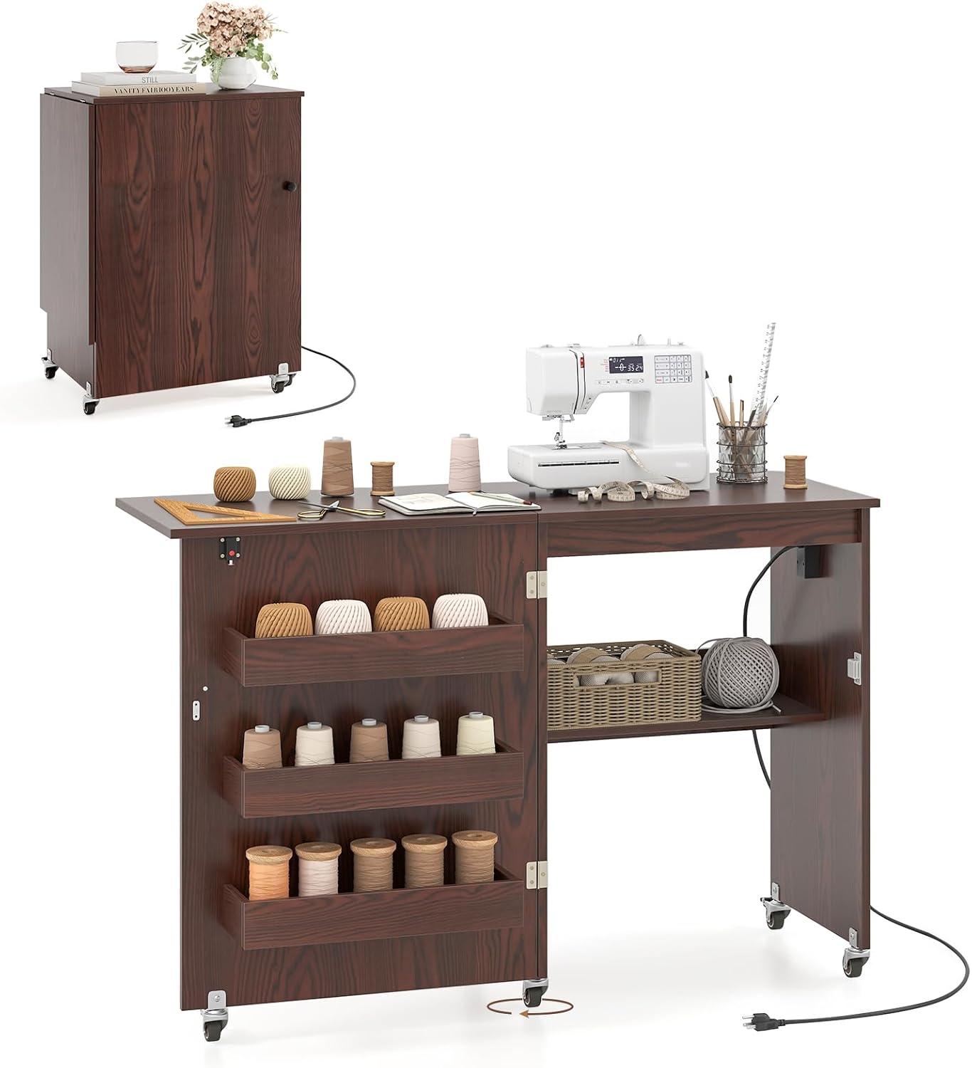 Description:Make your sewing art even more perfect with this folding sewing desk!Equipped with a built-in charging station offering various charging options, the sewing cabinet provides ample storage space with tabletop, storage shelf and open rack. The expandable and foldable crafting table features a convenient round handle for easy transitions between its unfolded and compact states. With 5 smooth swivel casters, including 3 lockable for stability, this versatile sewing desk ensures easy mobility and quick folding, making it perfect for use as a side table, study table or computer desk.Features:Multifunctional folding design serves as a sewing table, side table and computer deskCarefully designed handle and spring latch make folding smootherKeep necessary belongings in perfect order with 3-tier shelf, open rack and tabletopAchieve easy mobility and secure braking with 5 smooth swivel casters (3 lockable)Built-in charging station offers 2 AC outlets, a USB and Type-C port4.8 ft power cord allows for flexible placement optionsSafety is a priority with included anti-collision padsVersatile designs suitable for home, studio and study roomAssembly is requiredSpecification:Color: Brown/Natural/White & Natural/WhiteMaterial: Engineered Wood, MetalOverall Dimensions: 45.5" x 16" x 31" (L x W x H)Folded Dimensions: 23" x 16" x 31" (L x W x H)Dimensions of Tray: 14.5" x 4.5" x 2" (W x D x H)Dimensions of Open Shelf: 21" x 8.5" x 16" (L x W x H)Power Cord Length: 4.8 ftAC Outlet: 125V/12AUSB + Type-C: 5V/2.4AWeight Capacity of Fixed Tabletop: 45 lbsWeight Capacity of Folding Part: 45 lbsWeight Capacity of Shelf: 22 lbsNet Weight: 43 lbsPackage Includes:1 x Folding Sewing Table with Power Strip1 x User Manual