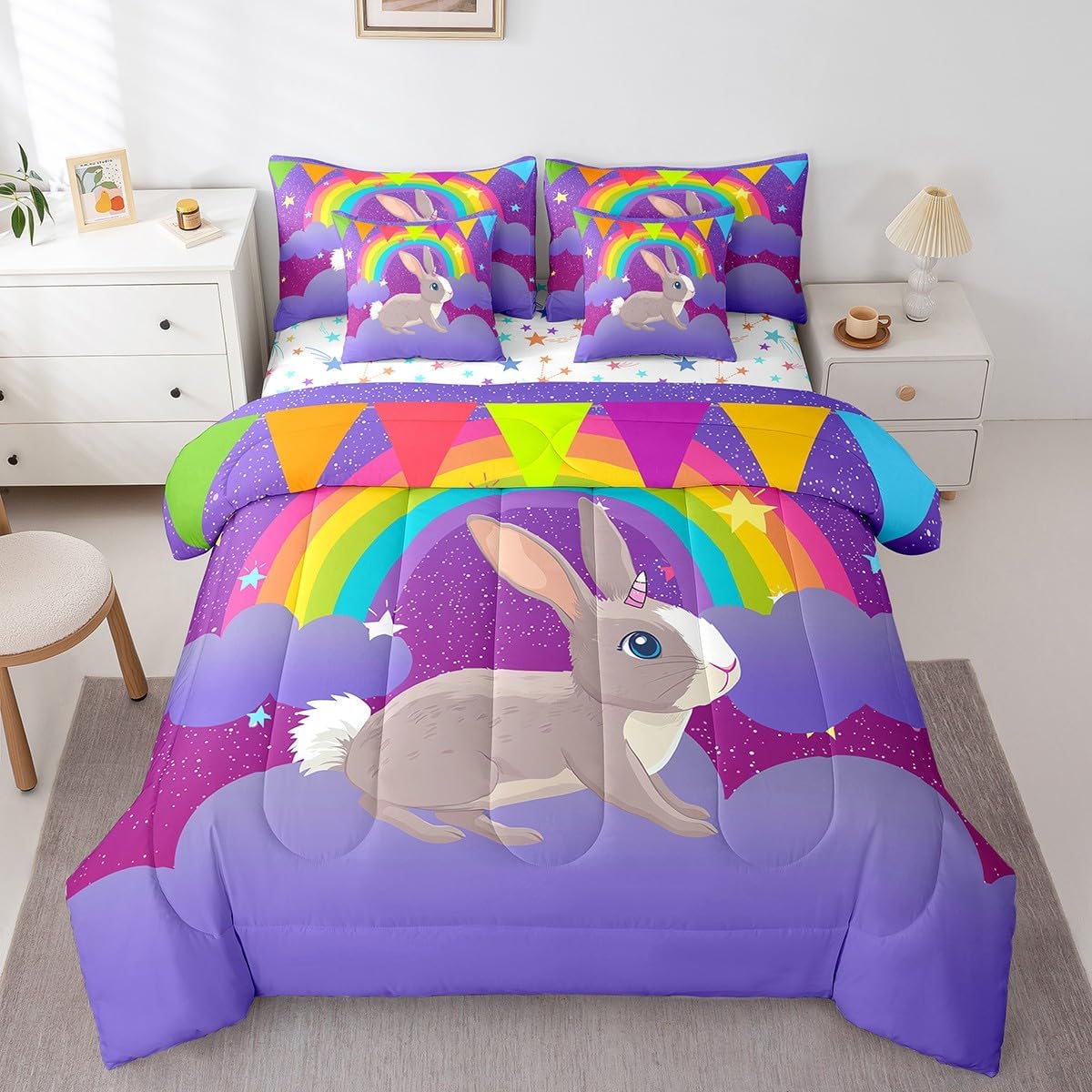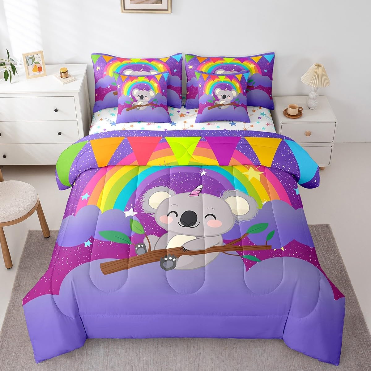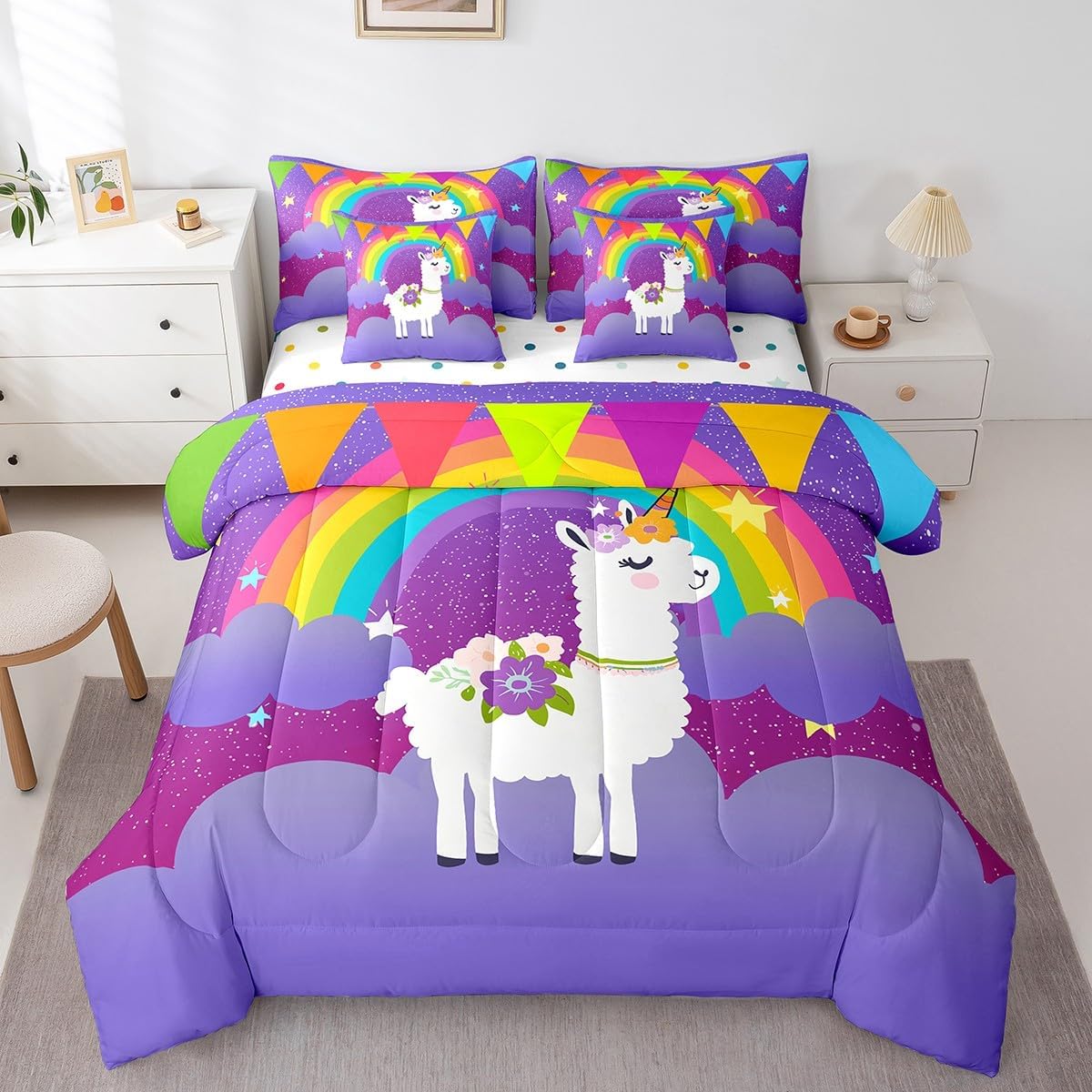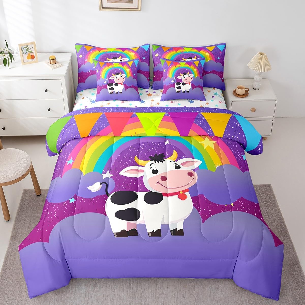 Colorful Makeover to Your Life Various size and color options, there are always decor room. Size Options: 7 Pieces Twin Size,1 Down Comforter 68"x 90", 1 Fitted Sheet 39"x75"x16", 1 Flat Sheet 96"x66", 2 Pillow Cases 30" x 20",2 Throw Pillow Covers,Covers Only. 18"x 18". 7 Pieces Full Size ,1 Down Comforter 79"x 90", 1 Fitted Sheet 54"x75"x16", 1 Flat Sheet 96"x81", 2 Pillow Cases 30" x 20",2 Throw Pillow Covers,Covers Only. 18"x 18". 7 Pieces Queen Size,1 Down Comforter 90"x 90", 1 Fitted Sheet 60"x80"x16", 1 Flat Sheet 102"x90", 2 Pillow Cases 30" x 20",2 Throw Pillow Covers,Covers Only. 18"x 18". 7 Pieces King Size,1 Down Comforter 104"x 90", 1 Fitted Sheet 78"x80"x16", 1 Flat Sheet 106"x90", 2 Pillow Cases 30" x 20",2 Throw Pillow Covers,Covers Only. 18"x 18". Decoration: For your mom, dad, sister, brother, grandma, wife, husband, and all other beloved with many surprising designs. You can find a design for everybody and every interest in our collection. Your Home,You Decide Different types of bedding sets could bring rooms in different styles. Also, rooms in different styles needs different types of bedding sets