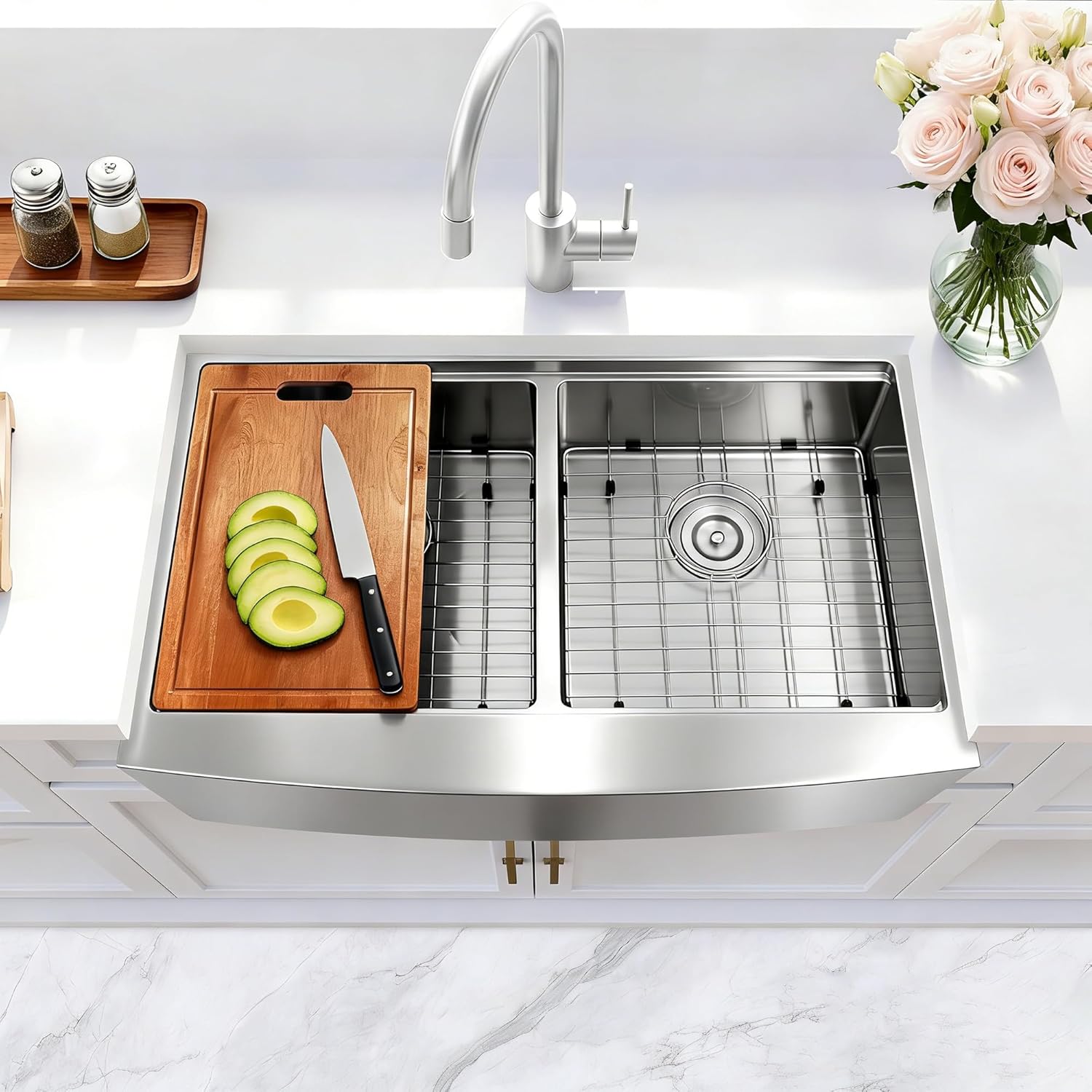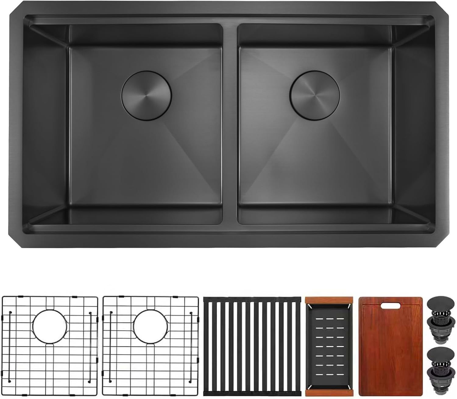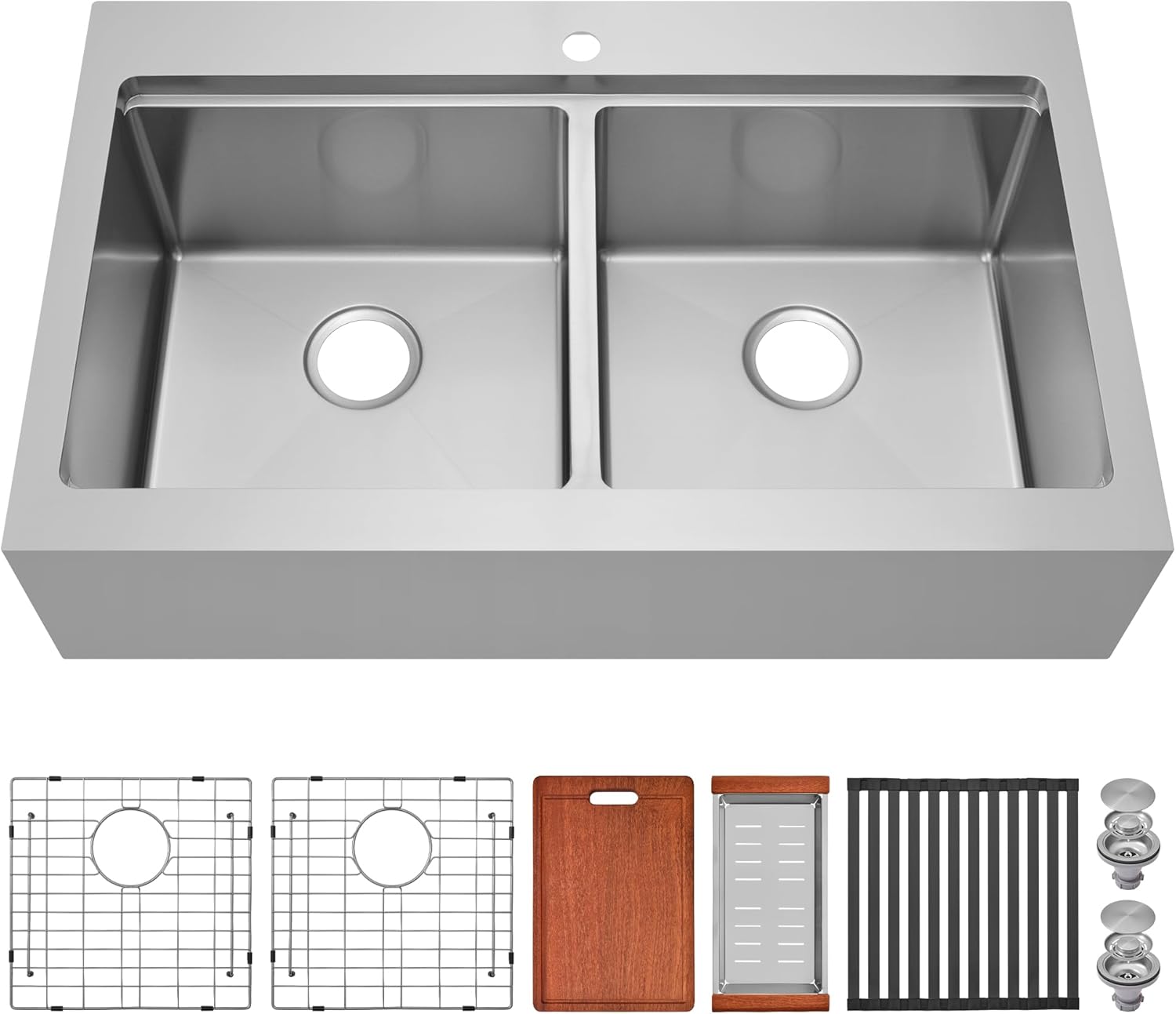 | Included Components | 1 x Double Bowl Kitchen Sinks, 1x Colander, 1 x Cutting Board, 2 x Sink Bottom Grid, 2 x Sink Drain Assembly with Basket, 1 x Roll-up Drying Rack |