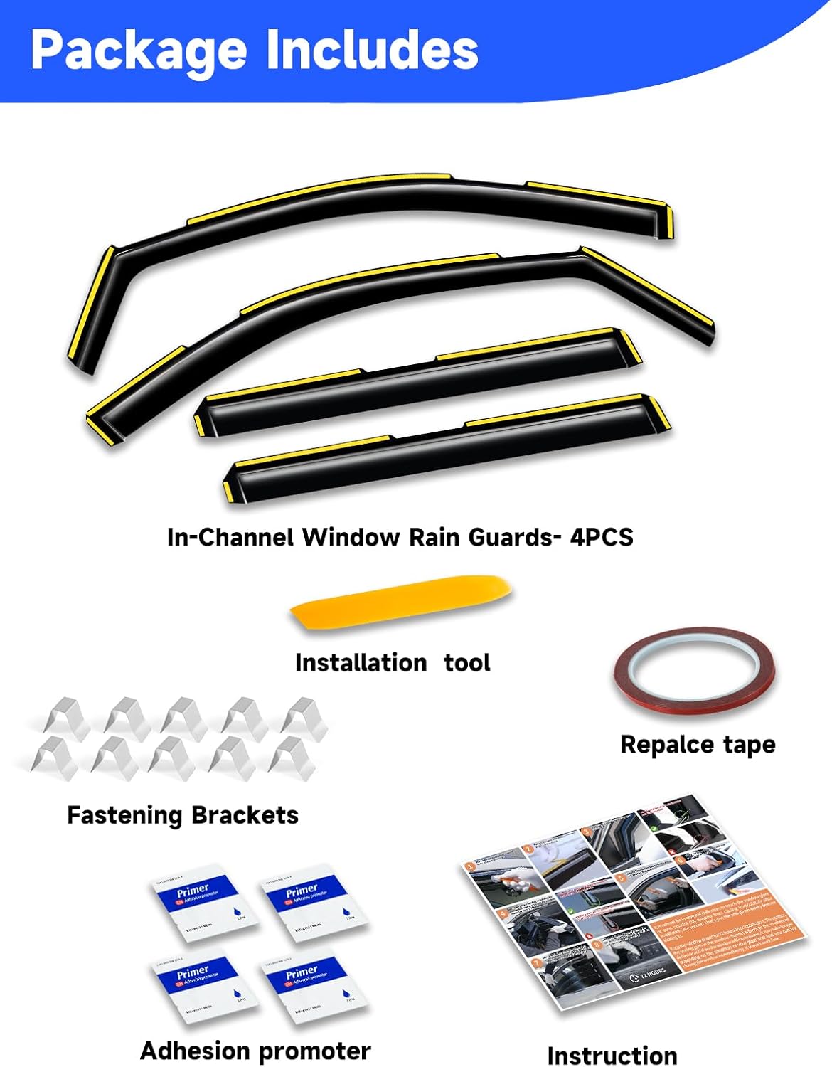 | Included Components | rain guards x4,Fastening Brackets x8,Adhesion Promoter x4,Repalce Tape x1,Instruction x1 |