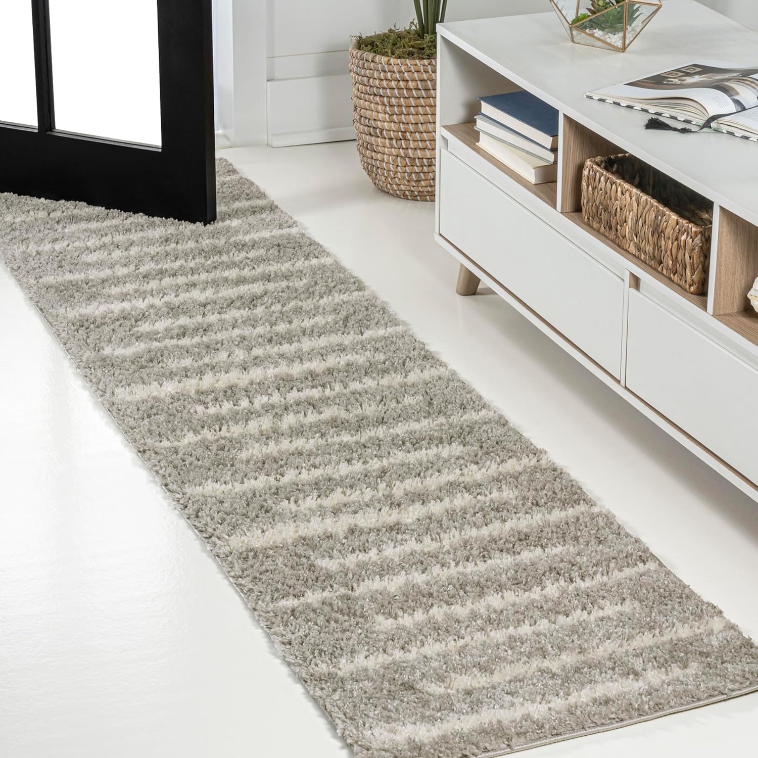 Inspired by vintage Moroccan rugs, our modern striped rug has a soft, low shag pile. The central stripe pattern is woven in black on an ivory background; our tribal-inspired design recalls traditional handwoven rugs. Add some Bohemian style to your living room, bedroom, or reading nook with this easy-care rug.