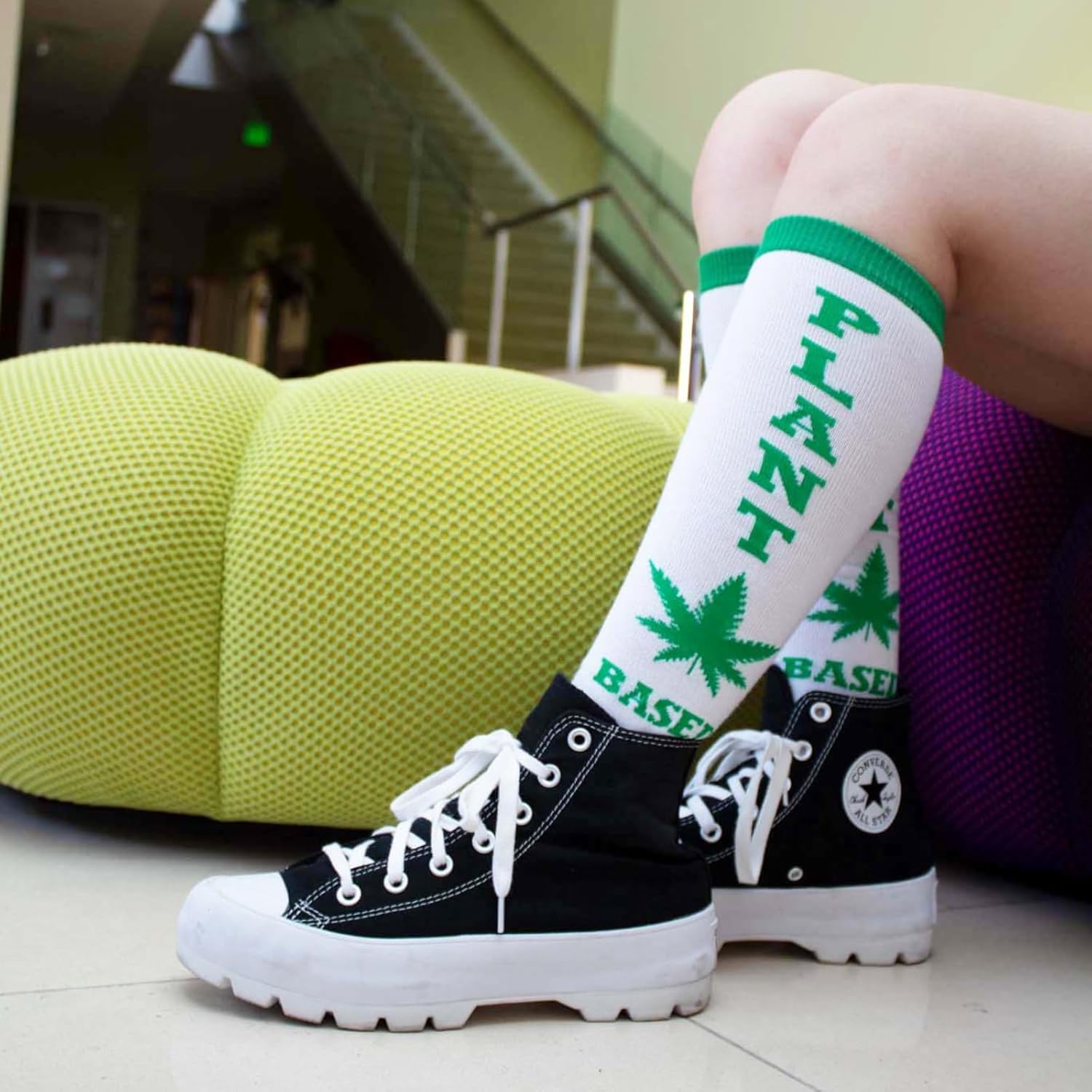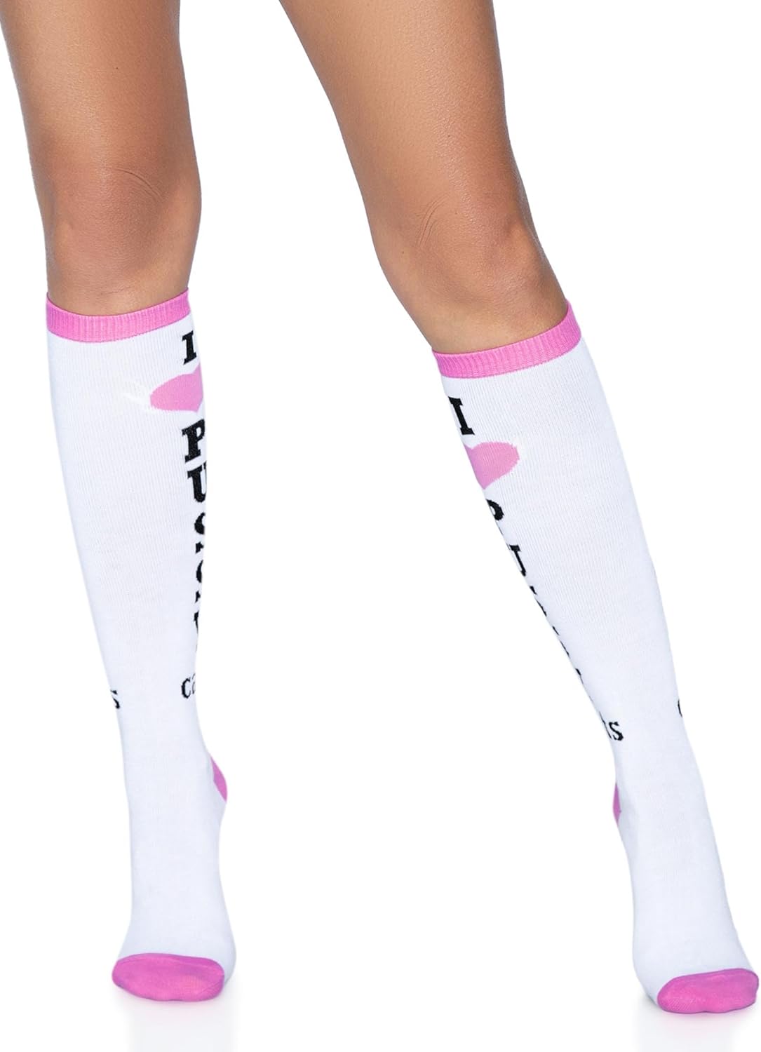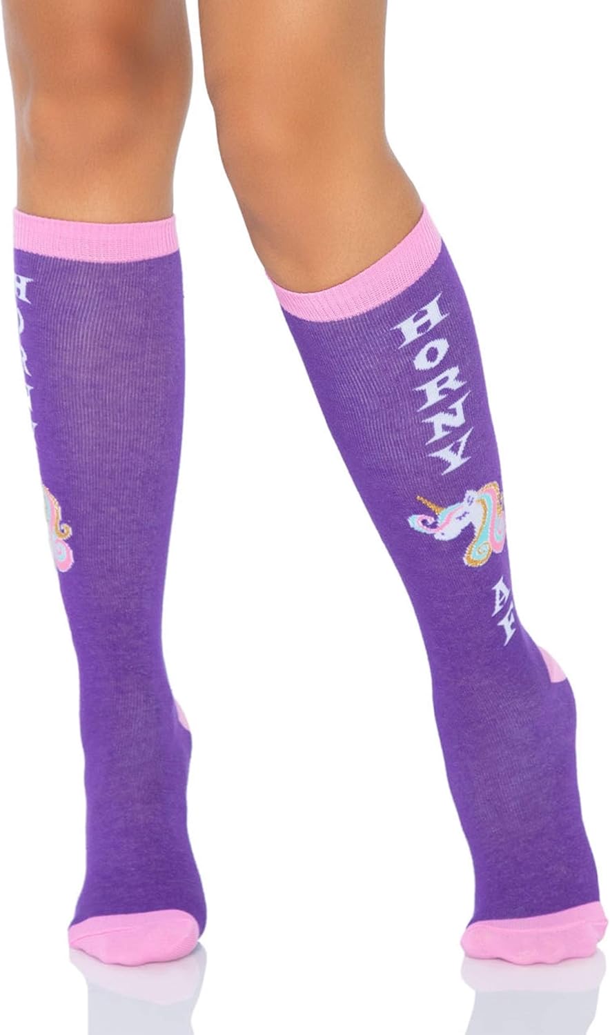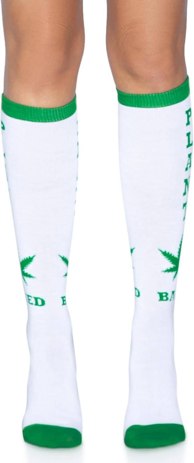 • Get a little fun when you slip on the Leg Avenue knee high party socks. The quirky athletic knee highs feature a colorful design, bold lettering and ribbed knit fabric.