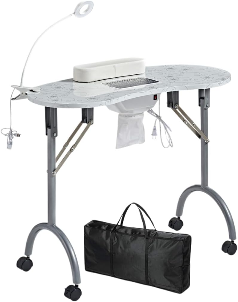 【Professional & Ergonomic Details】DIMENSIONS: 92x40x75CM - WEIGHT:10KG.Unlike traditional nail tables,our salon table is 6 centimeters higher than others, giving you a more comfortable angle. Besides, our nail table is a curved tabletop with safer rounded corners to avoid scratches. 【High Quality Materials】This sturdy and durable beauty technician desk is made of high-quality selected MDF board and thickened iron pipes.Besides, the stable triangular support structures can effectively avoid shaking during use. 【4 Lockable & Stable Wheels】4 lockable rolling wheels for controllable movement.You can lock angle and wheels to ensure stability.Wheels and tables with the same color look better. 【Removable & Foldable】This Manicure Table Nail Desk is designed with 2 folding legs,1 detachable drawer and 6 removable wrist cushion,for simplified storage & transportation. 【Protable & Easy to Assemble 】Only five simple steps for partial assembly,ladies friendly.We also come with a durable & dustproof handbag, which brings convenience for carrying.
