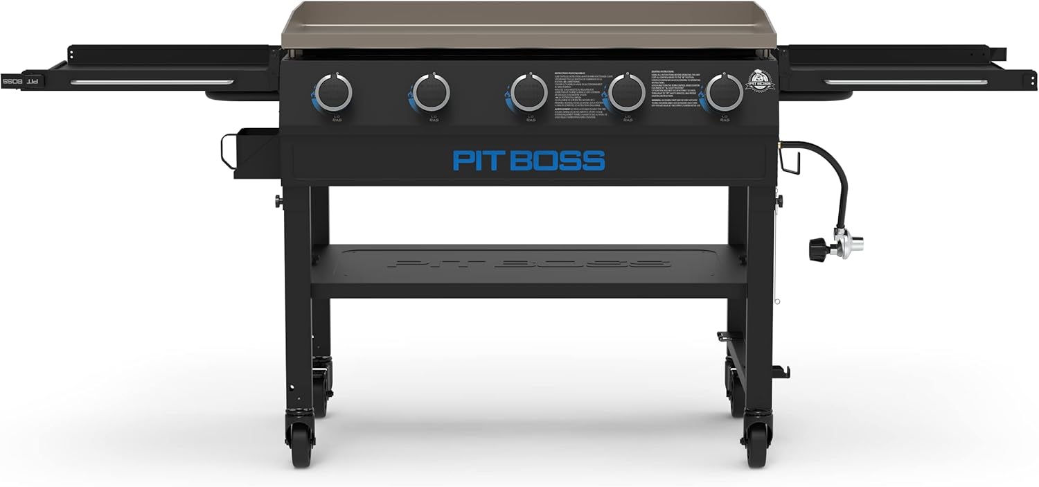 Meet the new lineup of Pit Boss® Standard Gas Griddles. Each Pit Boss 4-Burner Deluxe Gas Griddle is outfitted with a durable cooktop and robust BTU value for an experience that’s Bigger, Hotter, Heavier® than the rest. Enjoy the convenience and versatility of cooking with the Pit Boss 4-Burner Deluxe Griddle, complete with 753 square inches of cooking space, four separately controlled burners, folding side shelves, and lid. The folding legs offer a handy fold-and-go design, while the front grease management delivers easy, mess-free clean up. The PB4BGD1 is the perfect cooking appliance to use in your backyard or for outdoor camping trips and is backed by our best-in-class 2 year warranty.