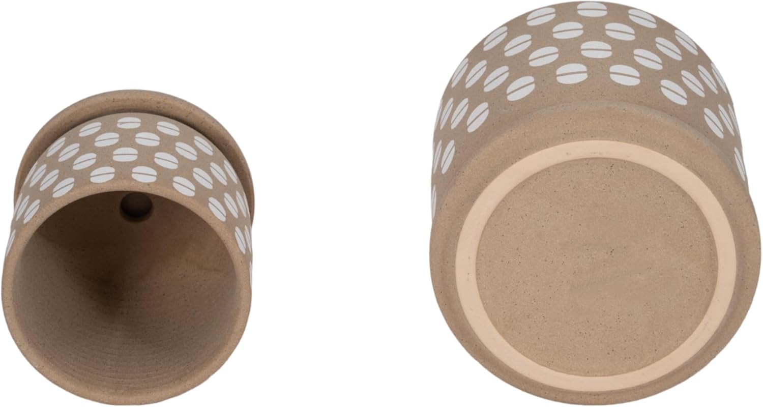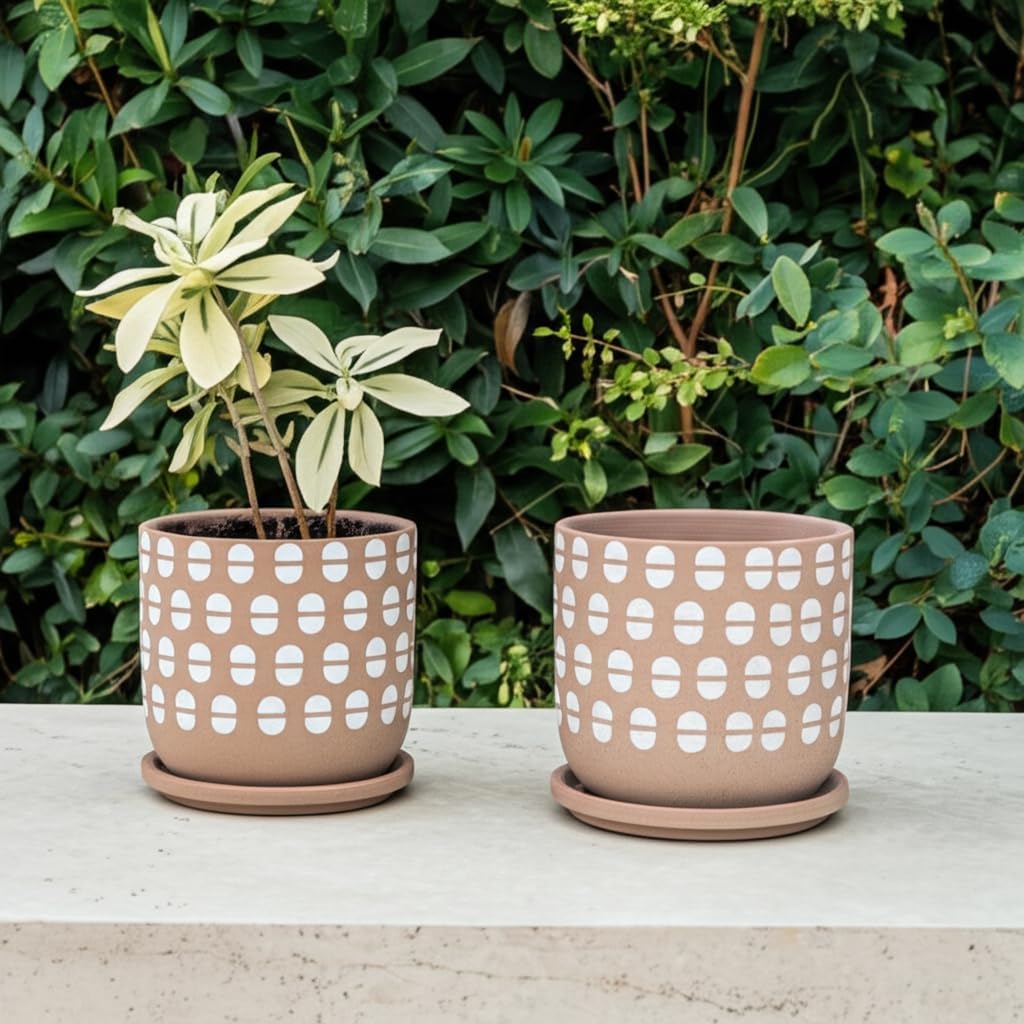 Enhance your indoor and outdoor decor with this stylish set of two saucer planters, designed to bring a modern and natural touch to any space. Crafted from high-quality stoneware and ceramic, these durable planters feature a warm tan finish with a contemporary geometric pattern, making them an eye-catching addition to any home, patio, or garden. The set includes two versatile sizes—6x6x6 inches and 5x5x5 inches—perfect for displaying a variety of plants, including succulents, flowers, herbs, and small houseplants. Thoughtfully designed with matching saucers, these planters help prevent water spills and protect surfaces, making them ideal for both indoor and outdoor use. The breathable ceramic material promotes healthy plant growth by allowing proper air circulation and moisture balance, ensuring your plants thrive in any environment. Whether placed on a windowsill, coffee table, or garden shelf, these decorative planters complement any decor style, from modern minimalism to rustic charm. Their neutral color palette blends seamlessly with any setting, making them an excellent choice for plant lovers and home decorators alike. This planter set also makes a perfect gift for birthdays, housewarmings, or any special occasion. Elevate your home or garden with these elegant and functional planters and bring a touch of greenery to your space today.