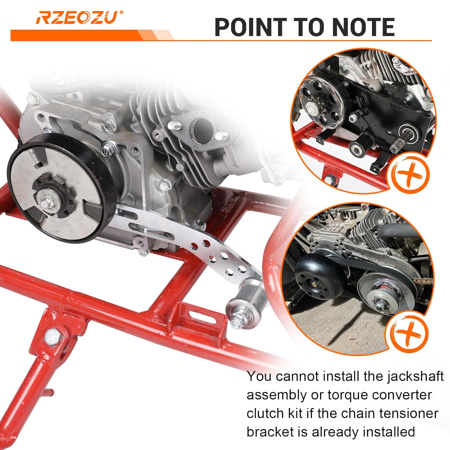 Product Details: Compatibility: The chain tensioner with roller is compatible with mini bike Coleman Baja Trailmaster Motovox Monster Moto with Predator 79cc 212 224 196cc GX160 GX200 engine Applicable Models: Coleman Powersports CT200U CT200U-EX CT200U-EXR BT200X mini bike, Baja Motorsports MB165 MB200 (Mini Baja, Baja Warrior, Baja Heat) mini bike, Baja DB30 mini bike, Monster Moto / Mega Moto MMB80 MMB105 mini bike, Motovox MBX10 MBX11 mini bike (Tip: A larger rear sprocket needs to be installed if you install this chain tensioner kit to Coleman CT100U or CC100X) Note: 1. You cannot install the jackshaft assembly or torque converter clutch kit if the chain tensioner bracket is already installed. 2. You should first install the chain tensioner bracket, and then proceed to install the clutch Attention: If the chain is close to the wheel, the clutch needs to be installed in reverse to ensure that the chain is in a straight line Function: The mini bike chain tensioner, as an important part of drive system, can adjust the tension of the chain, avoiding chain falling off, so as to improve the transmission and extend the service life