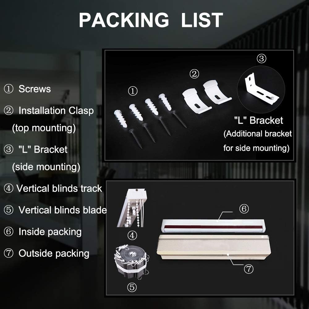 MOUNT TYPES: Inside mounted vertical blinds will have a deduction taken of approximately 0.4" to ensure a proper fit the window frame.Inside mounted blinds require a minimum frame depth of 2.4" for secure installation. If your window frame depth is less than 2.4" please select outside mount. Outside mounts are often used when there is not sufficient frame depth for inside mounting.Our window shade come with all mounting hardware, and mounting hardware for both inside mount and outside mountINSIDE MOUNT MEASUREMENT: Step 1.Measure the inside frame width at three locations-the top,middle,and bottom. Record the smallest of the 3 measurements and use that number deduct 0.4 " as your inside width when ordering.Step 2. Measure the height at 3 locations-the left,middle,and right side. Record the smallest of the 3 measurements and use that number deduct 0.4 " as your inside height when ordering.OUTSIDE MOUNT MEASUREMENT: Step 1. Measure the outside frame width adding 8" to be the outside mount width.Step 2. If your window is french window, measure from 2.4" above the top window frame to the place 0.4" above the ground. If your window is windowsill window, measure from 2.4" above the top window frame to the place 4 " below the bottom window frame. The overlap it recommended to allow appropriate coverage and avoid any light gaps.Type: 100% Blackout vertical window blindsFeature: Energy Saving, thermal insulated, uv protectionMaterial: FabricInstallation: All Mounting Hardware Included for both inside mounting and outside mounting.OPEN OPTIONS: Option 1.Sinle open, you can choose select open to left or open to right depends on your decision after you get the product.Option 2.Opposite open, open and close from the middlle of the blinds, when you control the cord, the blade is going to the left and right the same time.